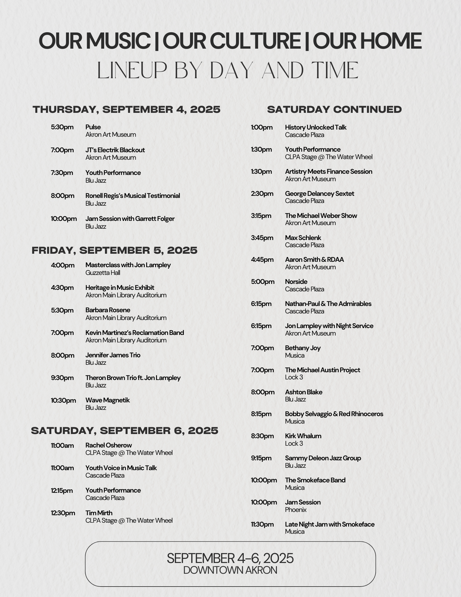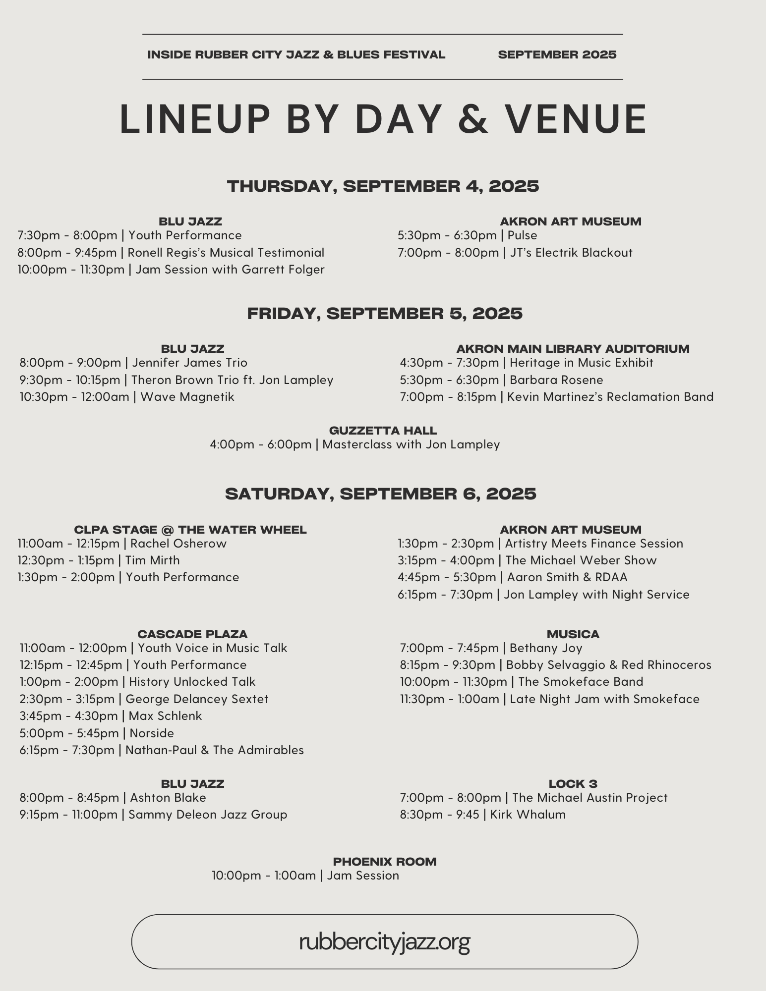 Although the Rubber City Jazz Festival has grown to feature the most world-renowned jazz and blues artists, a major focus is to continue to spotlight and platform the talent in the Akron-metro area.
